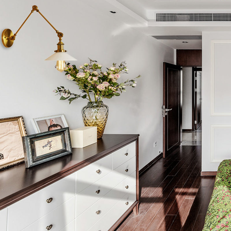 Die 1-flammige Wandleuchte aus weißem Glas und Messing im Industrie-Stil für das Schlafzimmer ist eine Wandleuchte, die sich perfekt für jeden Raum in Ihrem Zuhause eignet. Der elegante, weiße Glasschirm wird durch ein Messing-Finish akzentuiert und verleiht ihm einen modernen Industrie-Look. Die Leuchte ist LED-kompatibel und hat eine Spannung von 220–240 V bzw. 110–120 V. Der Schirm besteht aus Glas und der Arm hat eine Länge von 20 cm. Das Leuchtmittel ist nicht im Lieferumfang enthalten, der Sockel ist E26/E27.