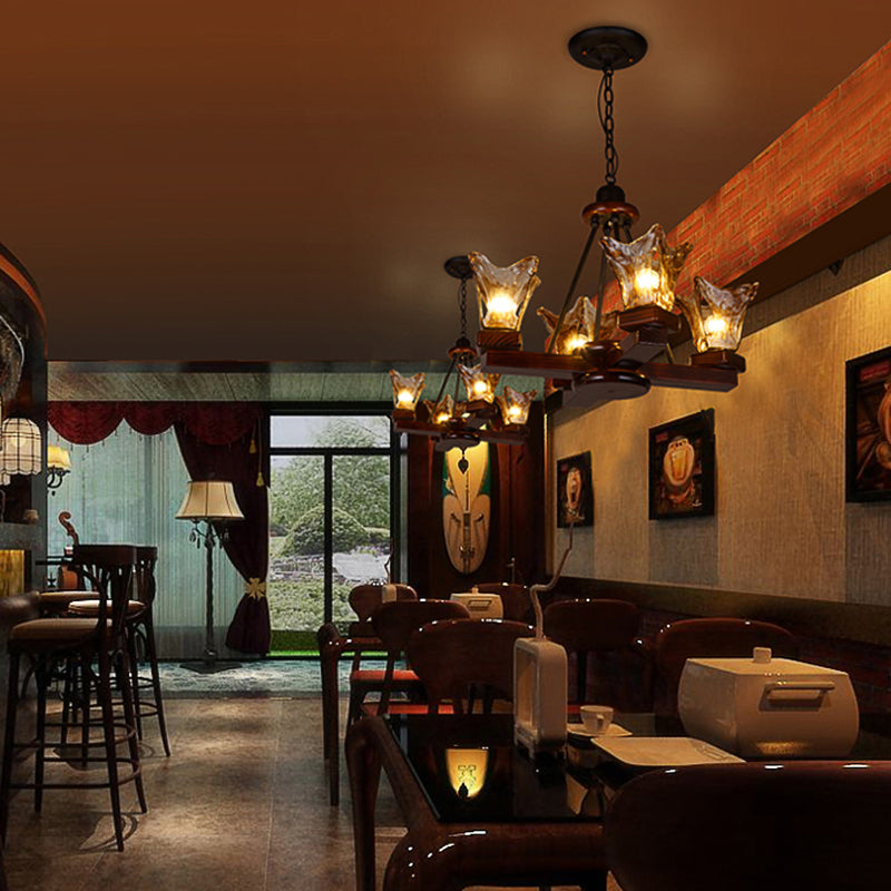 Rustikaler Blumenkronleuchter aus Holz mit hellbraunem Strukturglas – 4/6 Lichter Esszimmer-Pendelleuchte in Rotbraun